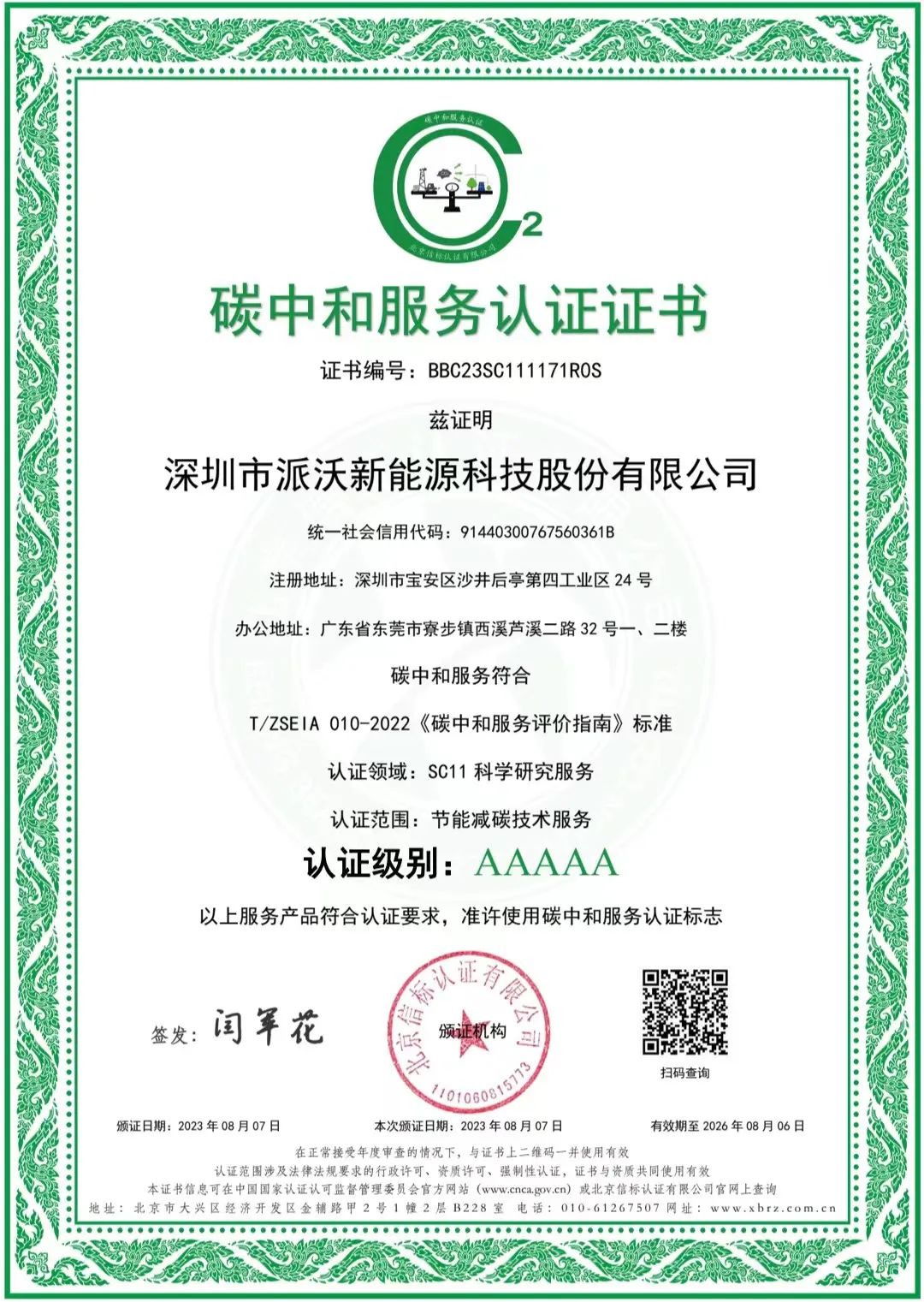 2023年8月,荣获碳中和服务认证证书