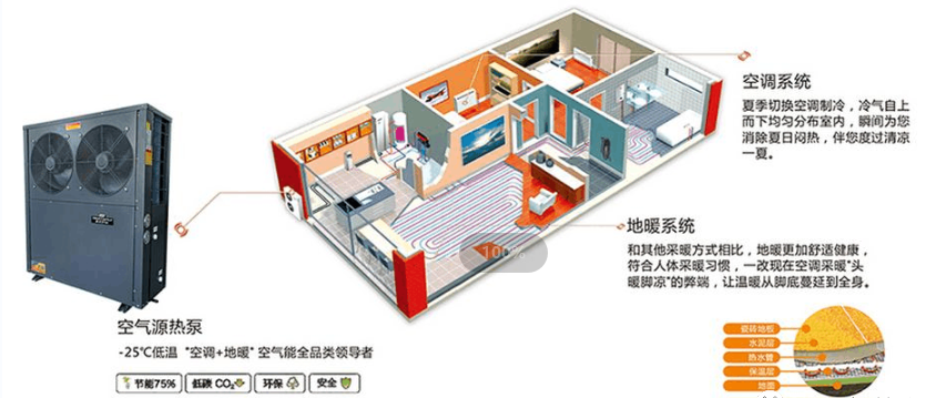采用先进的空气能技术,融合地板采暖的高效温升特征。运行节能效果大大提升,减少家庭运行费用。