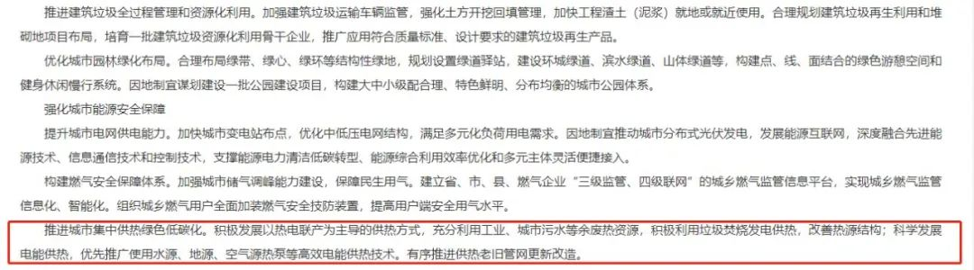 近日,河北省相关部门印发《“十四五”河北省城市基础设施建设实施方案》中提到:推进城市集中供热绿色低碳化。积极发展以热电联产为主导的供热方式,充分利用工业、城市污水等余废热资源,积极利用垃圾焚烧发电供热,改善热源结构;科学发展电能供热,优先推广使用水源、地源、空气源热泵等高效电能供热技术。