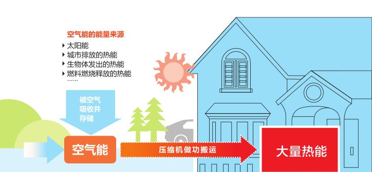 在地球的大气层中,储存了大量能量,比如太阳能,以及城市、生物体、燃料燃烧排放后的热能。而空气能热泵就是从空气中获取这些难以利用的低品位热能,通过电能做功,提供可为人们所用的高位热能的装置,是一种绿色清洁的新能源科技设备。